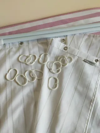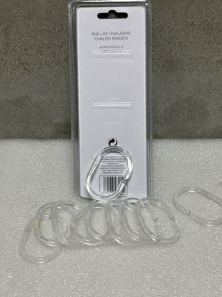 Anillas ovaladas transparentes para colgar cortinas de baño o ducha. Son de acrílico y vienen en un paquete de 12 unidades y 11 suelas .Nuevas y en perfecto estado. - Ideales para barras de ducha estándar. - Material resistente y ligero. - Fáciles de instalar.