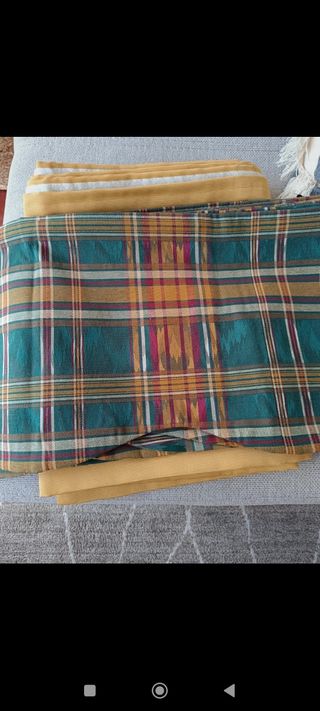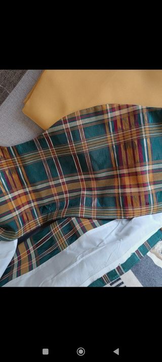 Bandó de cortina. De las fotos, solo me queda el verde de cuadros, pues el amarillo ya se ha vendido. Este Verde a cuadros, que no lleva velcro porque iba cosido al amarillo, va forrado por detrás, y que tiene forma de ondas en la parte inferior, mide 496 centímetros de largo, por 30 centímetros de alto (lo podéis cortar a la medida necesaria). Los tenía juntos para hacer conjunto. La confección es de tienda especializada en cortinas, y el paño es de calidad.