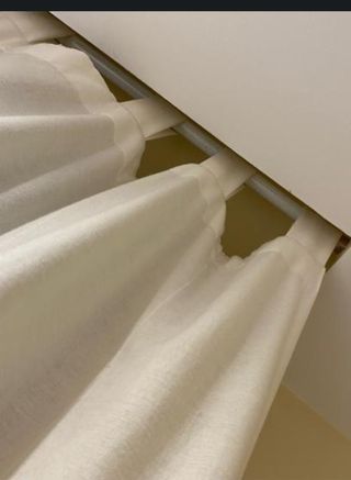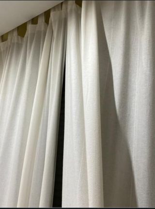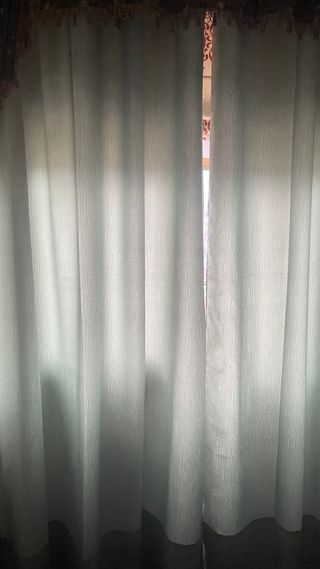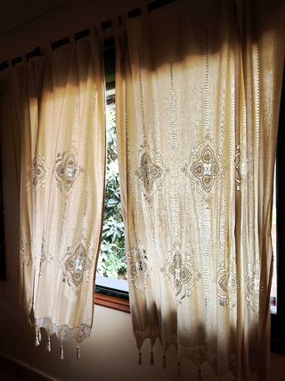 Cortinas color crudo con detalles calados. Semi-opacas. Dos patas para colocar en barra. Medida por pata 2,80 alto x 1,40 ancho (ancho total 2,80 metros). Perfecto estado (bajo sujeto por cinta adhesiva con plancha, falta despegar y lavar para adaptar a la medida deseada y quitar el polvo de tres meses).