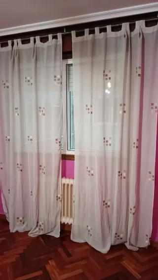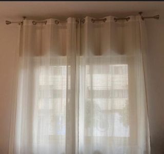 Hago envíos. Juego de 2 cortinas blancas, con barra extensible hasta tres metros, incluyendo los soportes de pared o techo, y sus tornillos. Las cortinas son de 135 centímetros de ancho cada pieza (135 x 2), y largo/alto 252 cm. Escaso uso. La tenemos en la habitación, pero sirve para cualquier estancia. - Cortinas de tela semitransparente. - Barra extensible de metal.