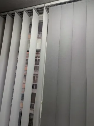 Cortinas verticales de lamas que aportan un toque moderno a cualquier estancia. Son fáciles de instalar y mantener. Tejido fácil de limpiar. - cubren una gran superficie de 2 metros de altura y casi 3 de largo en 2 partes iguales. - Son dos rieles de 145cm cada tramo. Cada uno con sus accionadores, en uno a la izquierda y en otro a la derecha. - Combinación de colores gris y blanco. - Materiales duraderos para un uso prolongado. - Compradas en Selma Vigo. Están como nuevas estéticamente y en cuanto a funcionamiento. - Se entrega un rollo de lamas de repuesto sin usar NO SE ENVÍA. SOLO QUIEN RECOJA EN VIGO NO SE VENDE NADA POR SEPAR