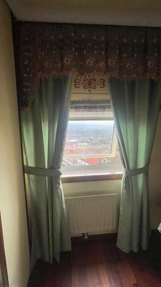 Conjunto de cenefa y sobrecortina en tono verde oliva. Añade un toque elegante a tus ventanas. - Diseño con fruncido en la cenefa. - Confección en tela de calidad. Más cortinas y cenefas de diferentes tamaños Por 30€ te llevas las de todas las fotos