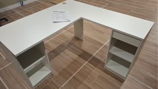 Escritorio de esquina KJELLARNE de IKEA. Sus dimensiones son 138x130 cm. - Diseño en L. - Acabado blanco. - Incluye compartimentos de almacenamiento y un cajón.