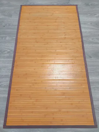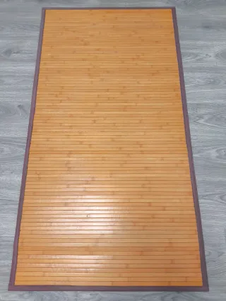 Alfombra de bambú con borde de tela. Tiene evidentes signos de desgaste pero poco apreciables a simple vista uno de los bordes de tela está cosido un poco y marcas en algunas lamas del bambú pero sin roturas medidas 1,5 cm de largo y 81 cm de ancho - Material principal: bambú. - Borde de tela. - Color principal roble claro - Color del borde: morado También hago enbios