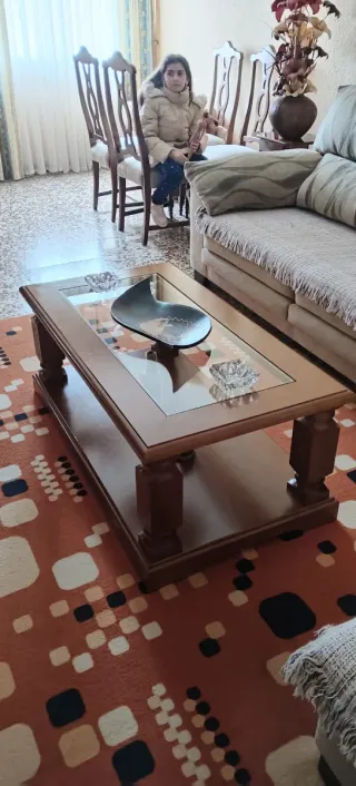 Elegante mesa de centro con un diseño moderno y funcional. Perfecta para dar un toque de estilo a tu salón. - Tablero superior de cristal transparente. - Base y patas de madera en tono marrón. No incluye Adorno.