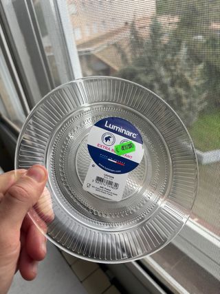 Set de 9 platos de postre de cristal de la marca Luminarc. Son completamente nuevos y a estrenar. - Diseño con relieve. - Apto para lavavajillas.