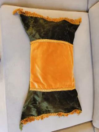 Cojín decorativo con un diseño bicolor y detalles de flecos. - Tejido principal de terciopelo. - Combinación de colores verde y naranja. - Adornado con flecos en los extremos.