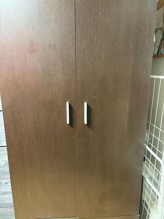 Armario de dos puertas con acabado en wengue. Un mueble práctico y elegante para tu hogar. Con 2 cajones y barra interior para colgar - Diseño moderno. - Tiradores metálicos.