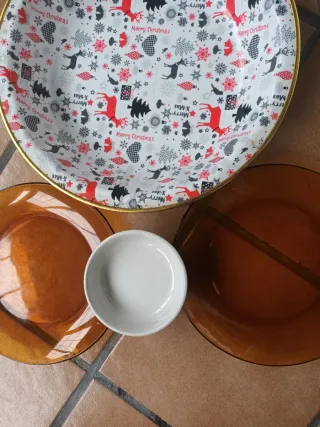 Conjunto de artículos de menaje con temática navideña. - Bol grande con diseño festivo. - Dos platos pequeños de cristal ámbar. - Un vaso pequeño de cerámica blanca.