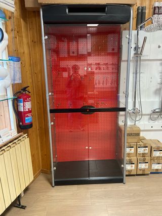 Vitrina expositora con puertas correderas y panel perforado interior. - Estructura de metal. - Puertas de cristal. - Panel trasero rojo. - Base oscura.
