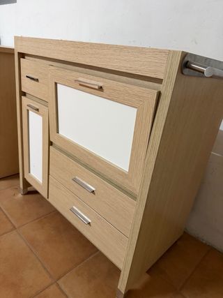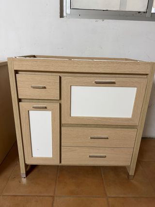 Mueble de baño con diseño de madera y detalles en mármol. - Encimera de mármol travertino para la base del lavabo - Acabado en tonos beige y marrón. - Espejo de madera El mueble ya está desmontado