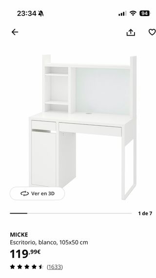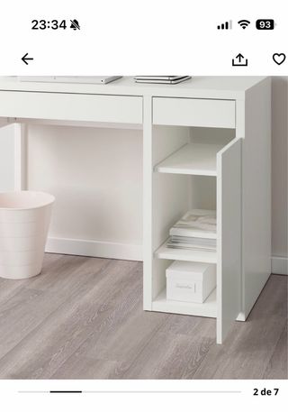 Escritorio MICKE en color blanco, con unas medidas de 105x50 cm. - Diseño moderno y funcional. - Incluye cajón y compartimento con puerta. - Estantería superior integrada. - Dos meses de uso, como nuevo