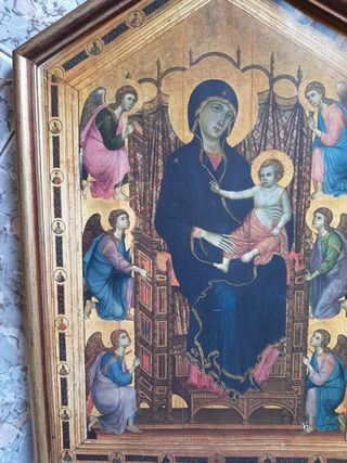 Antiguo cuadro religioso con marco de madera. - Representación de la Virgen con el Niño y ángeles. - Marco dorado con detalles. - Estilo artístico clásico.