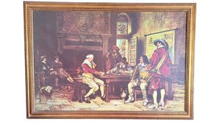 Elegante cuadro de estilo clásico que representa una escena ambientada en el siglo XVII, con varios caballeros reunidos alrededor de una mesa. La obra está firmada por el artista E. M. Guarotto, conocido por sus escenas históricas y costumbristas. El cuadro está enmarcado en un marco dorado que realza su carácter antiguo y decorativo. Ideal para amantes del arte clásico, coleccionistas o para aportar un toque de distinción a tu salón, despacho o biblioteca. Marco: Dorado con relieve, en buen estado general Estilo: Clásico / Histórico