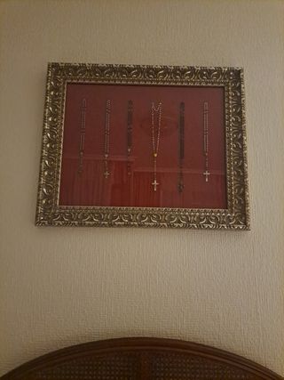 Cuadro de rosarios antiguos de plata, de monja, de nácar...