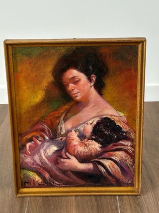 Precioso cuadro antiguo que representa a una madre con su bebé. Es una pieza única y llena de encanto. - Lámina barnizada - Enmarcado en madera dorada. - Presenta colores cálidos y una textura notable.