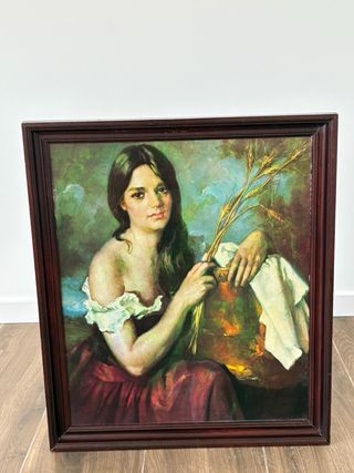 Preciosa pintura antigua enmarcada en madera oscura. Representa a una mujer con espigas de trigo. - El marco es de madera de color marrón oscuro. - La pintura parece estar en buen estado, aunque se recomienda una inspección visual para una evaluación completa. - Ideal para decoración vintage o clásica.