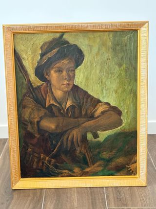 Preciosa pintura antigua que representa a un niño con un rifle. Se encuentra en un marco de madera dorado. - Óleo sobre lienzo. - Pintado con una técnica impresionista. - Perfecto para coleccionistas de arte.