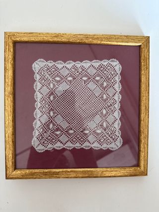 Precioso cuadro con un delicado encaje de bolillos, ideal para decorar cualquier espacio. Se encuentra en perfectas condiciones. Dimensiones 22x22 - El marco es de madera color dorado. - El encaje es blanco y de apariencia artesanal.