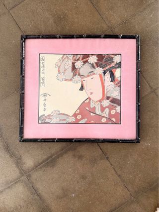 Antiguo cuadro oriental bordado el seda, con una escena japonesa tradicional. Enmarcado en la tienda Rembrandt de Barcelona en los años 70, con paspartú rosa y cristal protector. Marco de madera pintado en negro, en forma de ramas de bambú. Inscripción y firma.