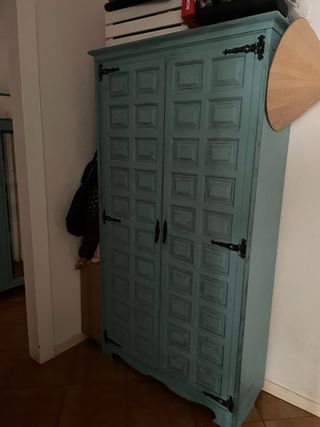 Precioso armario antiguo con un diseño único y un acabado desgastado que le da mucho carácter. - Puertas con paneles cuadrados. - Bisagras y tiradores de metal negro. Yo le puse unas baldas pero tiene barra para colgar ropa.(foto) lateral derecho trasero roto