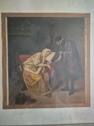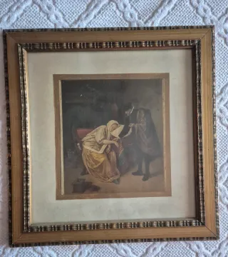 Vendo cuadro pequeño con reproducción antigua de una escena clásica del siglo XVII (escuela holandesa), en la que aparece un médico atendiendo a una mujer enferma. Impresión antigua en tonos sepia, montada sobre paspartú y con marco original de época, ideal para decoración vintage o rústica.