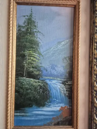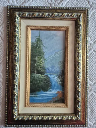 Vendo cuadro decorativo de pequeño formato con bonito paisaje de montaña, río y cascada. Pintado a mano sobre tabla/lienzo (no lámina), con un marco antiguo trabajado en dorado y madera bicolor, ideal para decoración clásica, rústica o vintage.