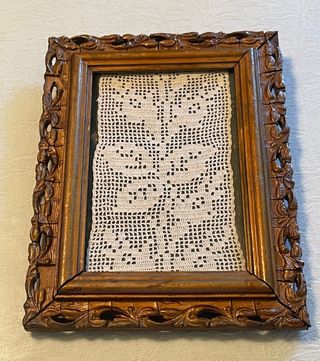Preciosa pieza antigua. Un cuadro con un delicado bordado hecho a mano, luce en una bonita marco de madera. - Bordado de encaje blanco. - Marco de madera tallada de color marrón.