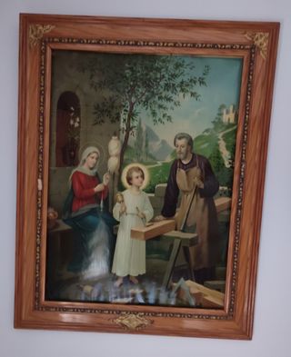 Precioso cuadro antiguo que representa la Sagrada Familia. Se encuentra en un marco dorado de madera. La parte de cristal de arriba a la derecha está algo rota, como se ve en la foto.