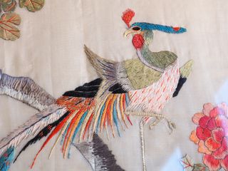 Cuadro con pájaro exótico bordado en seda. Antiguo