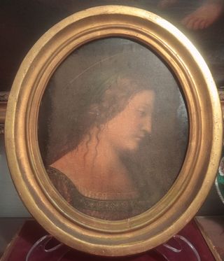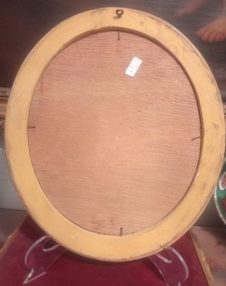 Se vende este bonito y antiguo cuadro ovalado inspirado en modelos italianos en el que se representa a la Madonna. Conserva su marco original de época. Medidas: 34 cm de alto X 30 cm de ancho.