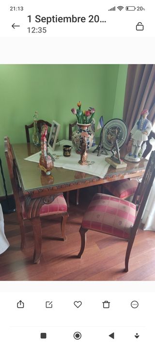 Preciosa mesa de comedor de madera con 4 sillas. La mesa tiene un sobre de cristal y las sillas tienen una tapicería a cuadros rojos y beige. Es un conjunto elegante y en buen estado. - Mesa de madera tallada - Sobre de cristal - 4 sillas con tapicería Se venden los 3 elementos del salón