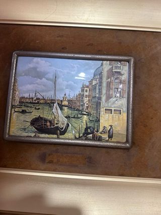 Precioso cuadro antiguo con un detalle de escena. - Marco con acabado dorado y detalles en madera. - Imagen central con escena de canal y barcos. se envia