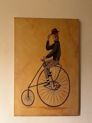 Precioso cuadro al óleo con una escena vintage. - Representa una persona montando una bicicleta antigua. - Tonos cálidos en el fondo. - Marco de madera.