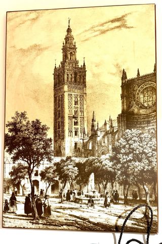 Cuadro lámina de La Giralda y Patio de los Naranjos de la Sevilla antigua sobre madera.