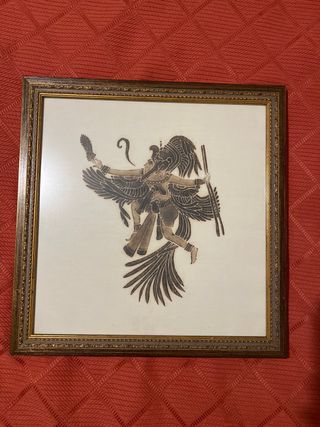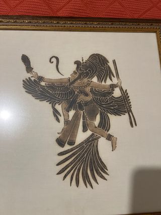 Este cuadro presenta una figura mitológica detallada, con un diseño que evoca culturas antiguas. - Marco con acabado dorado y detalles. - Representación artística en tonos oscuros.