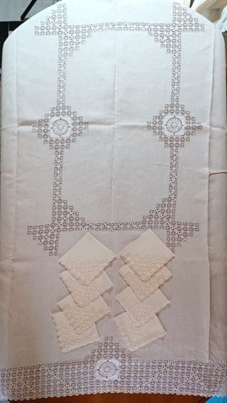 Manteleria de hilo fino y encaje de Brujas. Color marfil oscuro, tiene 8 servilletas de 40 cm y el diametro es de 173 cm. Nueva.Pago mediante Transferencia,wallapop o Bizum.LLEVANDO VARIOS ARTICULOS HAGO DESCUENTO.Excepto en ofertas y promociones NO LEER Minerales,antiguedades,decoracion,regalos,antiguo,bronce,lenceria,coleccion,quarzo,madera caja,bordado,artesanal,piedras,figuras,cuadro.