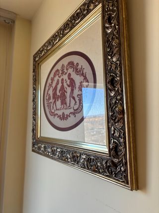 Preciosa reproducción de un cuadro clásico, en un marco dorado de madera. Es una pieza única que añadirá un toque de elegancia a tu hogar. - Reproducción de alta calidad. - Marco de madera con detalles dorados. - Perfecto estado de conservación. (Escucho ofertas)