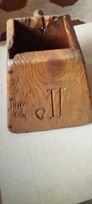 Preciosa jarra de madera, ideal para decoración. Es una pieza antigua con señales del paso del tiempo que le dan un encanto único. - Presenta grabados. - Tiene forma cuadrada con una pequeña asa.