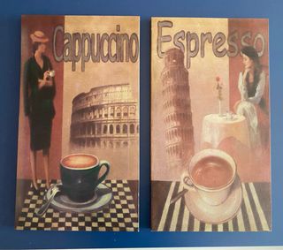 Cuadro decorativo con escena de cafetera antigua y taza de café. - Representación artística de un molinillo de café. - Detalle de una taza con café y cucharilla. Medidas,25x20