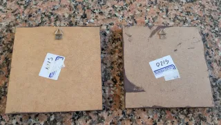 Conjunto de dos cuadros con un diseño que evoca paisajes serenos y tonos cálidos. - Cada cuadro presenta un diseño dividido en casillas. - Marco de madera con acabado envejecido. - Motivos naturales con árboles y cielos.
