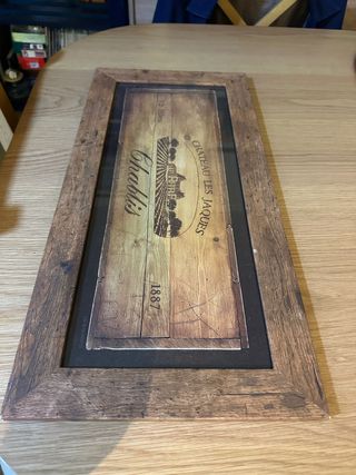 Este cuadro decorativo aporta un toque rústico y elegante a cualquier espacio, inspirado en las etiquetas de vino tradicionales. - Diseño con textura de madera. - Motivo de bodega Chateau Les Jaques Chablis. - Marco de estilo madera envejecida.