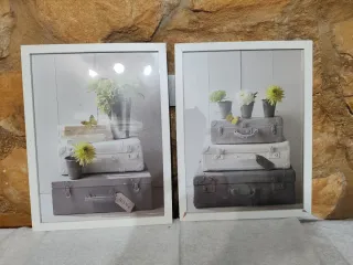 Conjunto de dos cuadros decorativos con un diseño de maletas apiladas y flores. - Marco de madera blanco. - Impresión sobre papel.