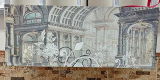 Precioso cuadro decorativo con un diseño inspirado en arquitectura clásica. - Tonos beige y grises. - Marco de madera. - Tela impresa de alta calidad.
