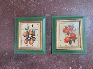 Conjunto de dos cuadros decorativos con motivos de frutas. - Marco con acabado en madera y detalles dorados. - Diseño de peras en un cuadro y naranjas en el otro. - Cada cuadro mide 37x32