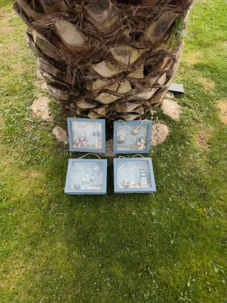Conjunto de cuatro cuadros decorativos con temática marina, perfectos para añadir un toque costero a tu hogar. Cada cuadro presenta un diseño único. - Marco de madera con acabado azul. - Cristal protector. - Diseños variados: faro, barcos, peces y salvavidas.