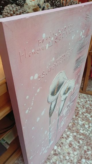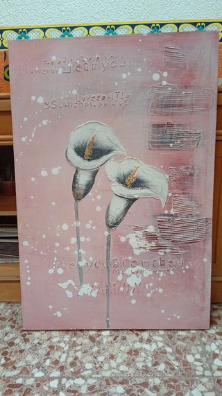 Se vende este bonito cuadro decorativo de unos lirios de agua o calas completamente nuevo, esta sujeto a un bastidor, la medida es de 90x60