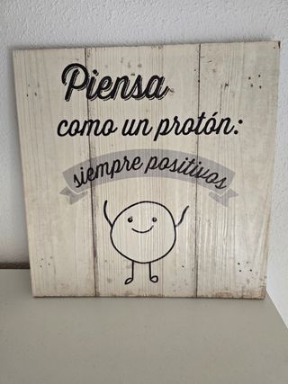 Precioso cuadro de madera con un diseño positivo y original. Ideal para decorar cualquier espacio. - Mensaje inspirador: "Piensa como un protón: siempre positivos". - Estilo rústico y elegante. - Perfecto para regalar.