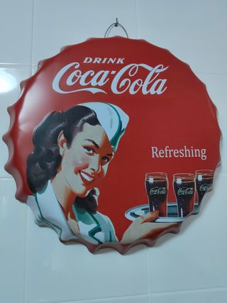 Este llamativo cuadro decorativo con forma de tapa de Coca-Cola aportará un toque retro a tu espacio. Presenta un diseño clásico con la icónica marca. - Diseño circular con borde ondulado. - Imagen de una camarera sirviendo Coca-Cola. - Texto DRINK Coca-Cola y Refreshing.