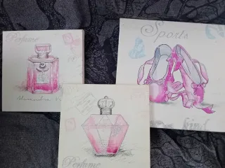 Conjunto de tres cuadros decorativos de Belle Poc. - Diseño con temática de perfume y zapatillas de ballet. - Detalles brillantes y acuarela. - Cada cuadro tiene un tamaño diferente para una composición única.
